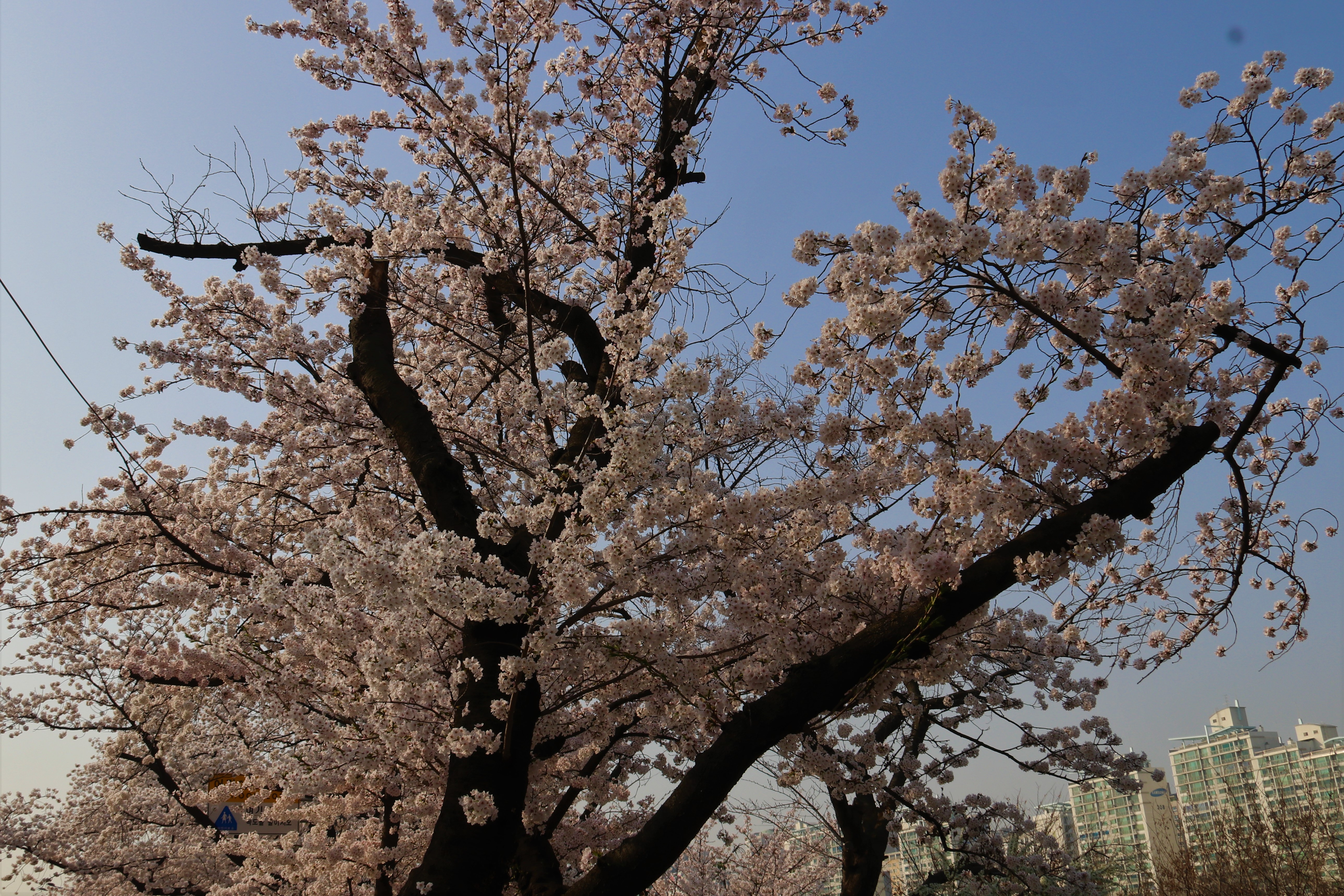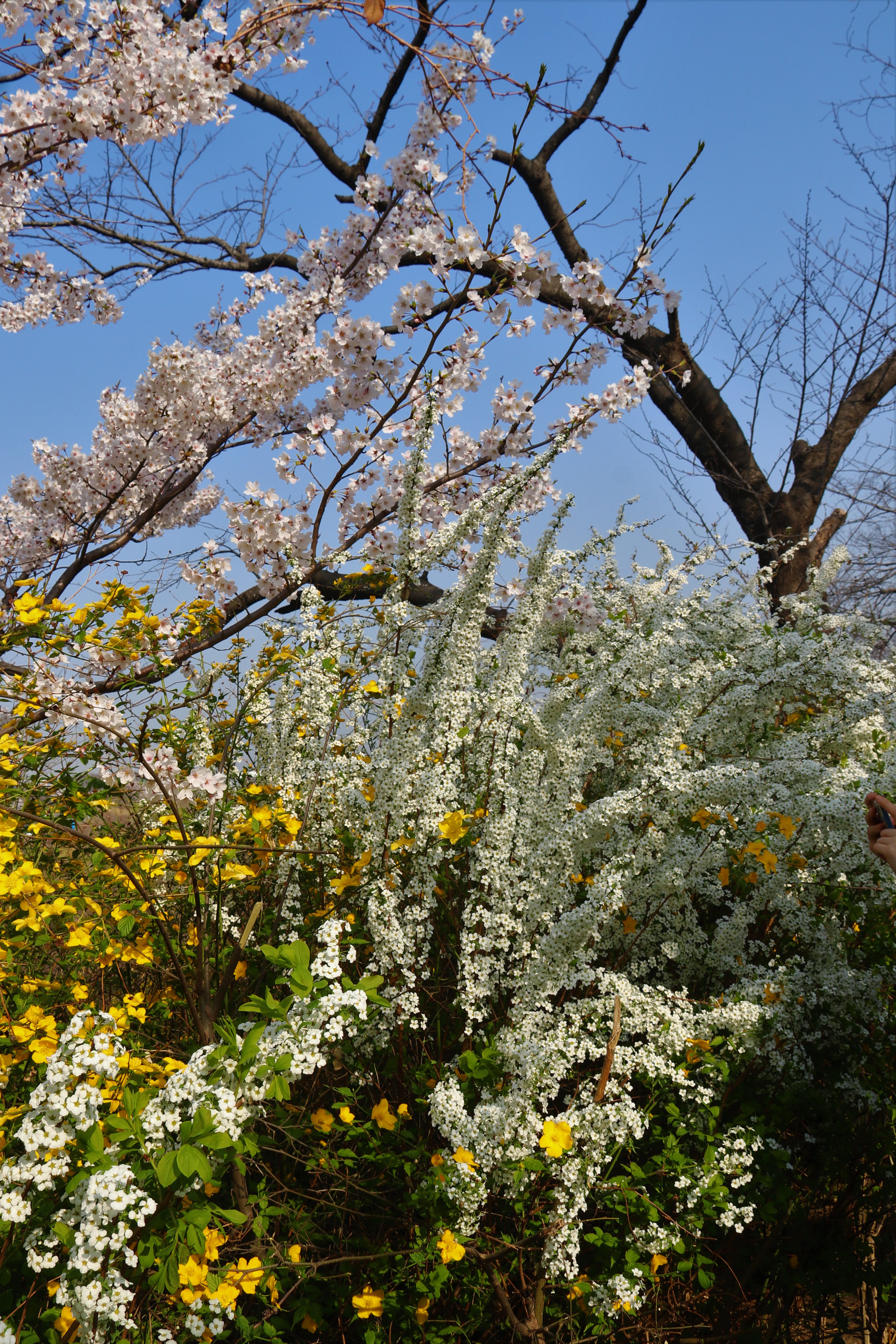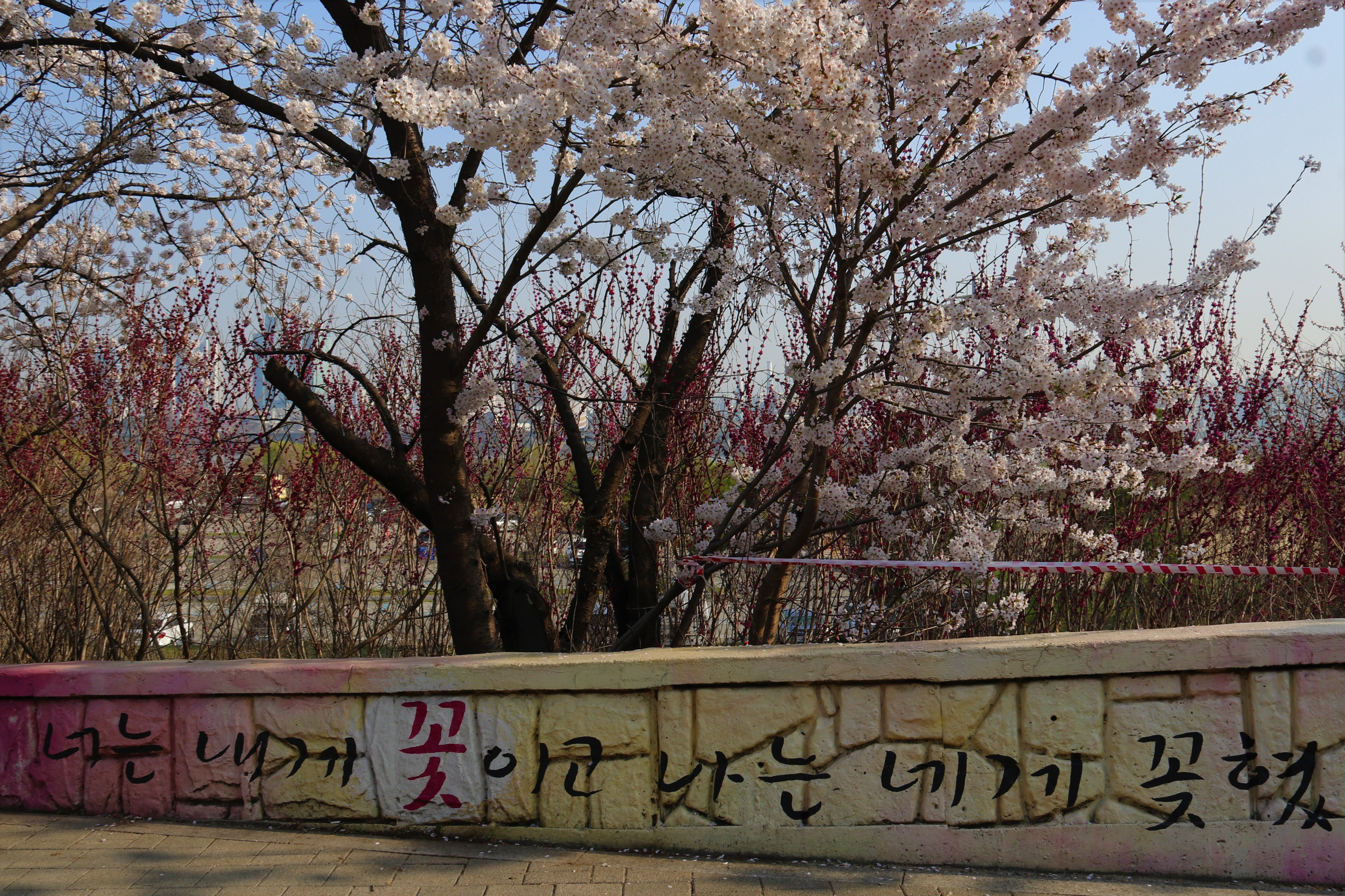 만개한 벚꽃으로 가득한, 큰 크기 ‘대벚꽃‘그리고 여전히 남아 ‘흰 매화‘, 빨간색 ‘명자나무꽃‘, 하얀색 ‘클로버‘수업 ‘목련 나무‘, 노란색 ‘개나리 꽃‘ 등의 봄꽃 사진을 찍었습니다..