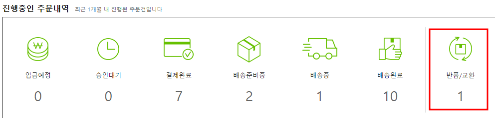 신청이 정상적으로 처리되고 반품/교환 탭에 상품이 1개 추가된 것을 확인할 수 있습니다.