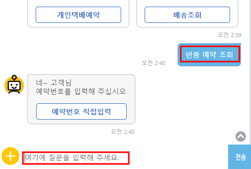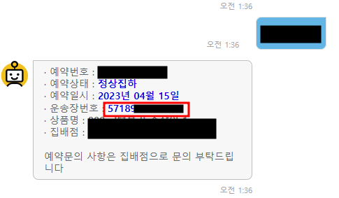 예약번호를 입력하면 챗봇이 진행상황과 운송장번호를 알려줍니다.