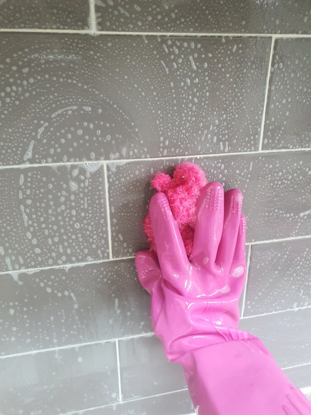 3. 타일에 수세미를 문질러 거품이 골고루 퍼지도록 합니다.