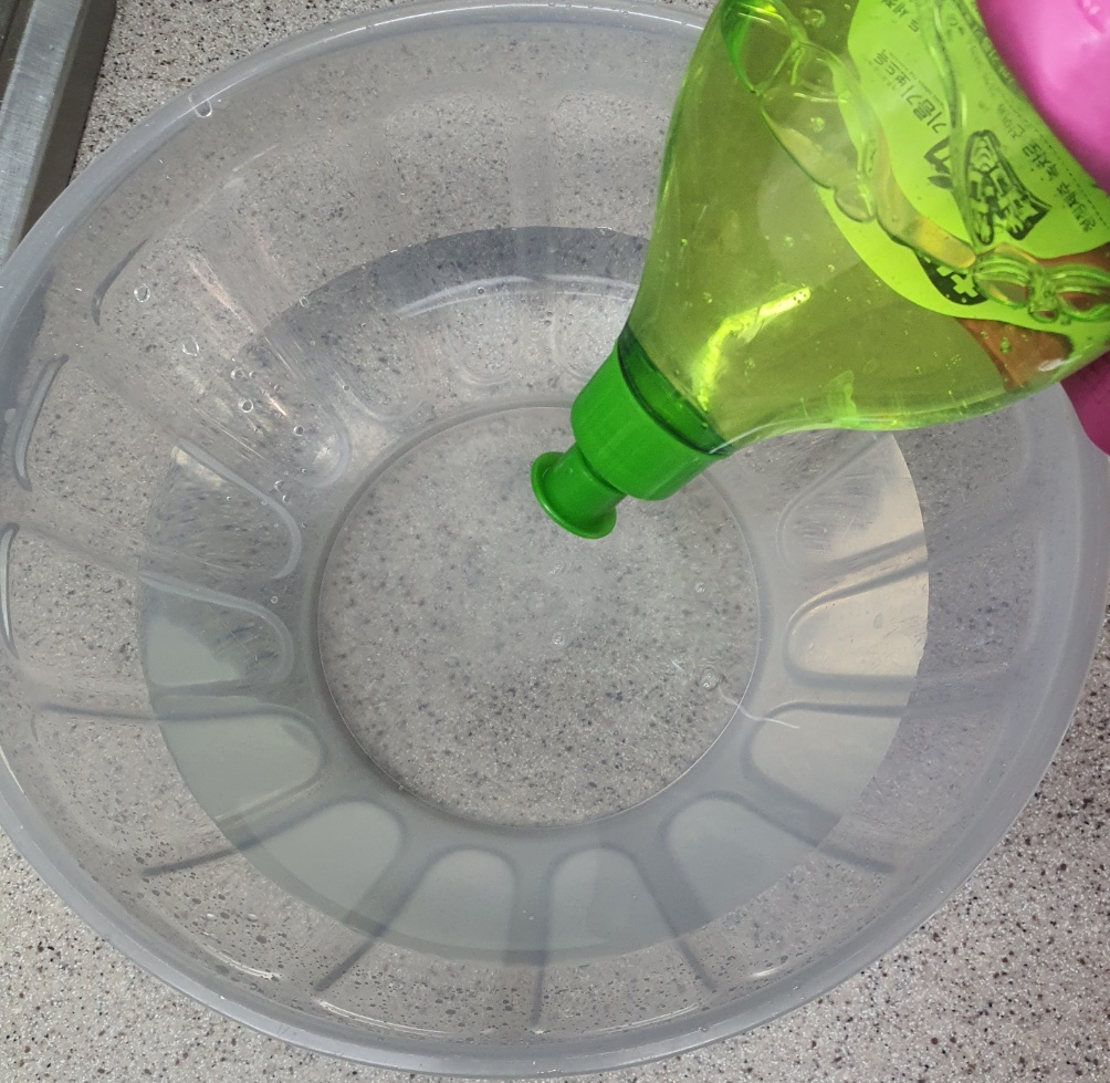 1. 대야에 미지근한 물을 붓고 주방세제를 2~3번 짜줍니다.
