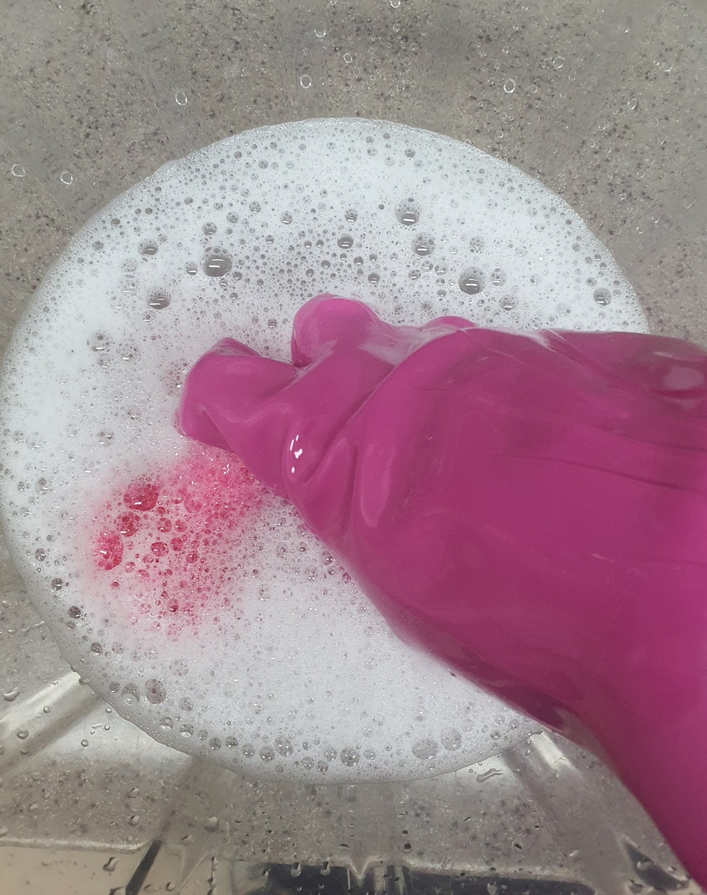 2. 부드러운 수세미를 적셔 거품을 낸다.